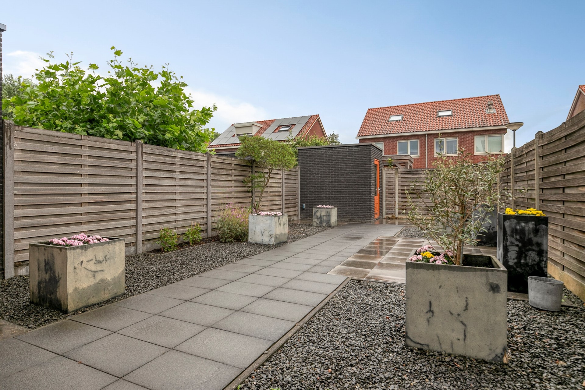 De tuin is onderhoudsvriendelijk, geheel omsloten en heeft een vrije achterom. Achterin de tuin staat een berging van ca 2.5 x 2.0 m.