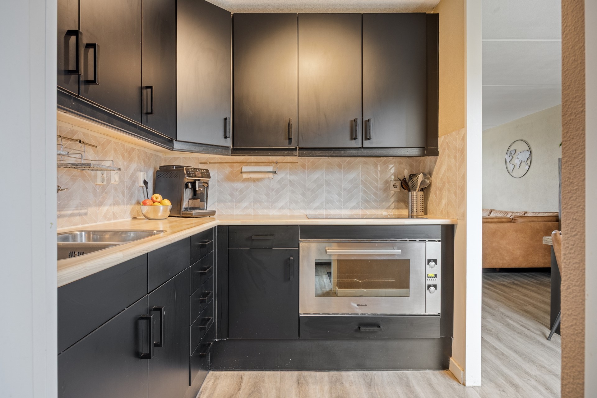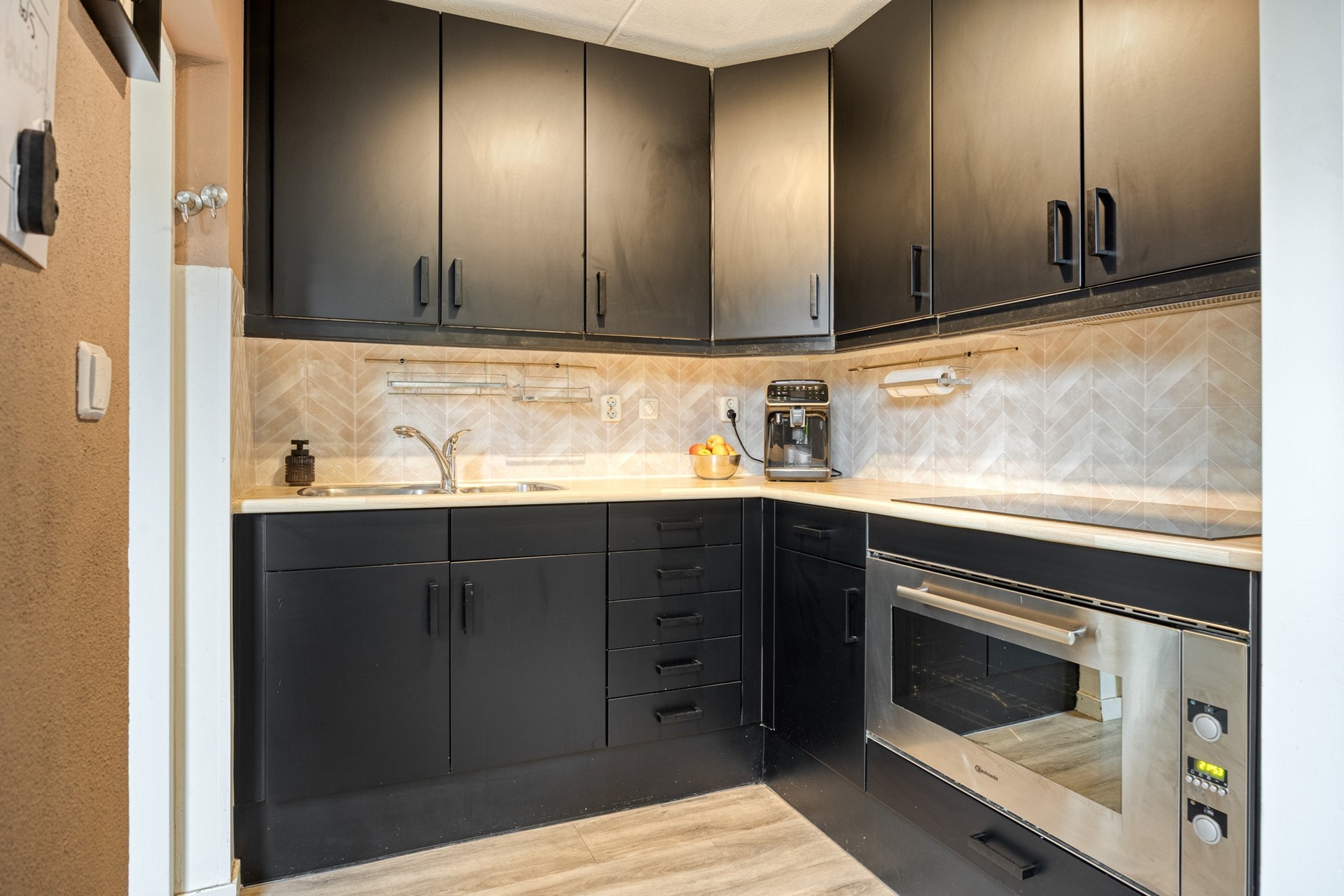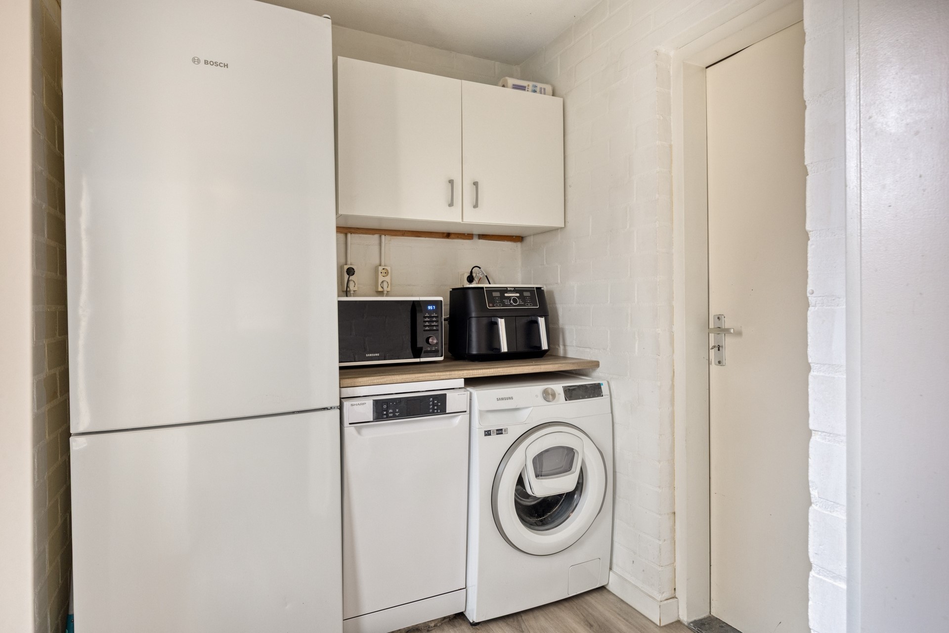Aan de achterzijde ligt de hoekkeuken. Deze heeft een inductiekookplaat met afzuigkap en oven. Aansluitend vind je de bijkeuken – ideaal voor voorraad en witgoed – met toegang tot buiten. Vanuit hier loop je door naar de extra lange garage met elektrische overheaddeur en deur naar de tuin.