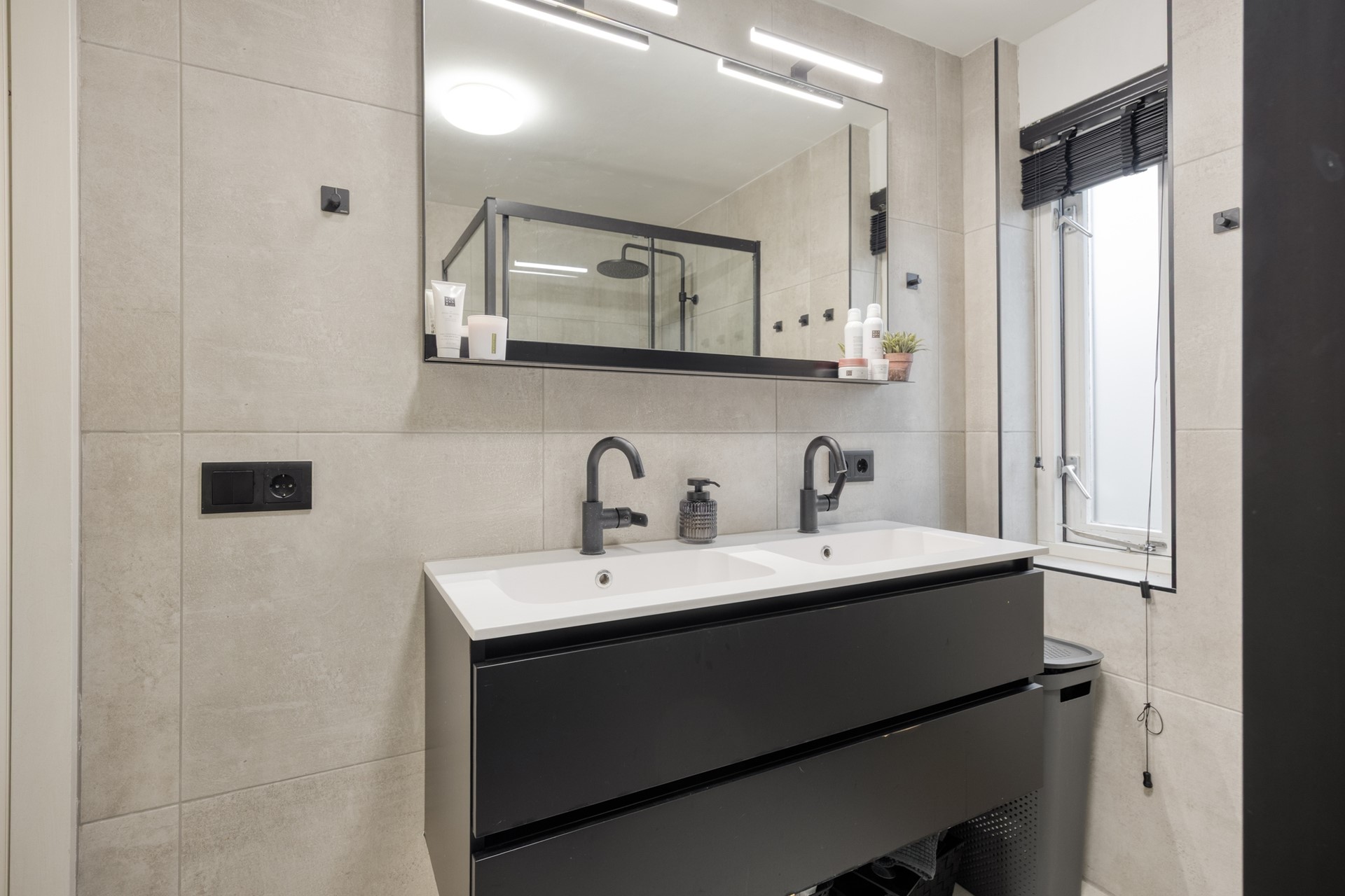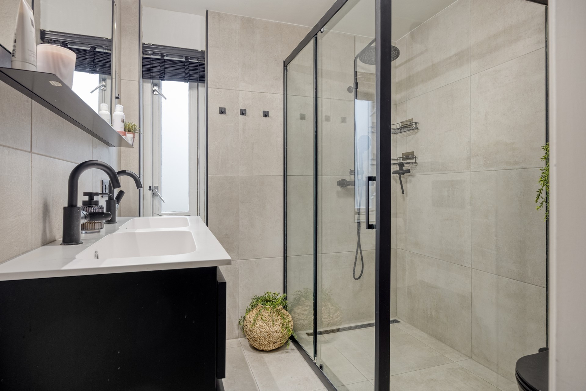 Op de eerste verdieping bevinden zich twee slaapkamers, waarvan één extra royaal (dit waren voorheen twee kamers), die voorzien is van een schuifwandkast. Perfect als master bedroom. De moderne badkamer heeft een inloopdouche, dubbel wastafelmeubel en toilet.