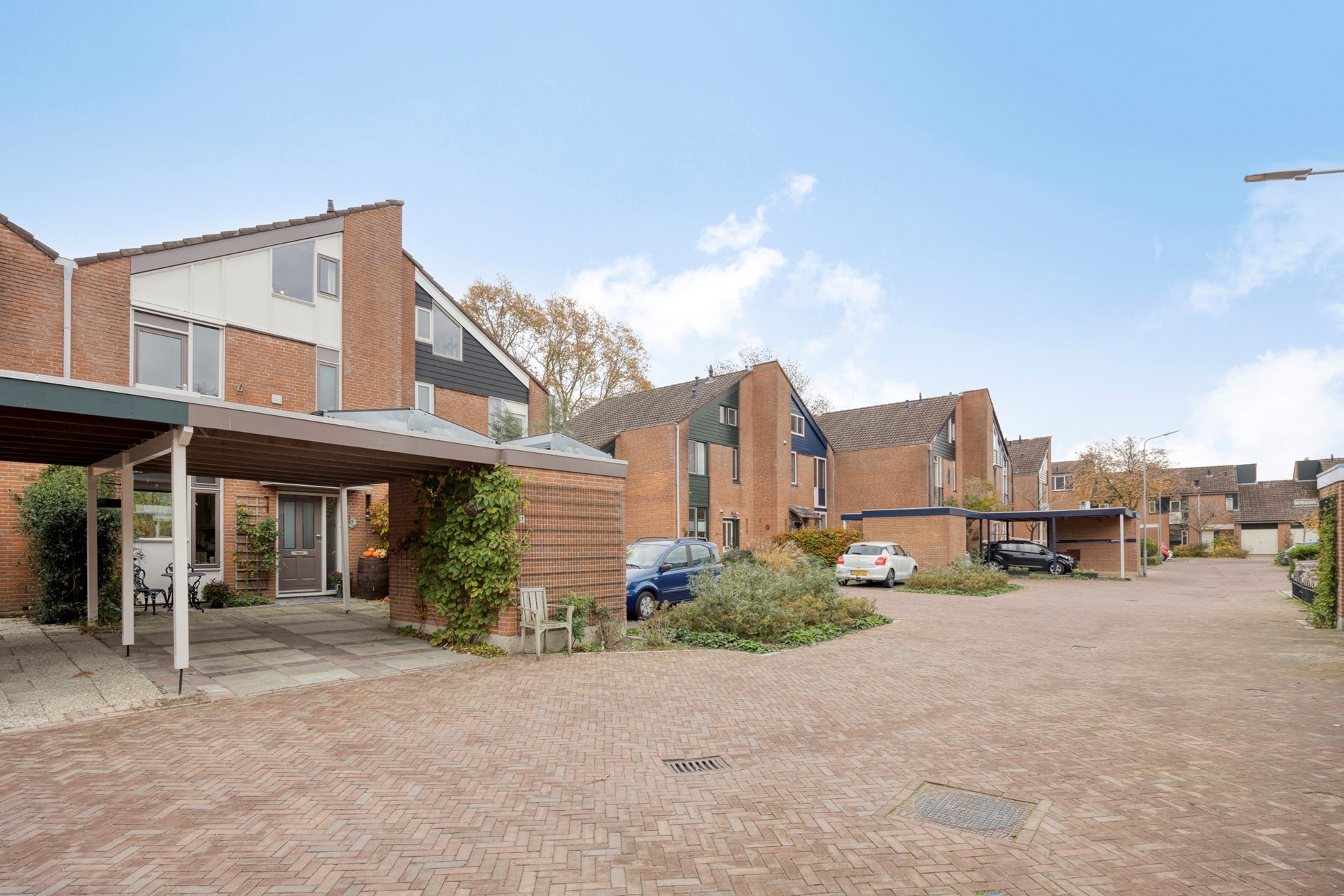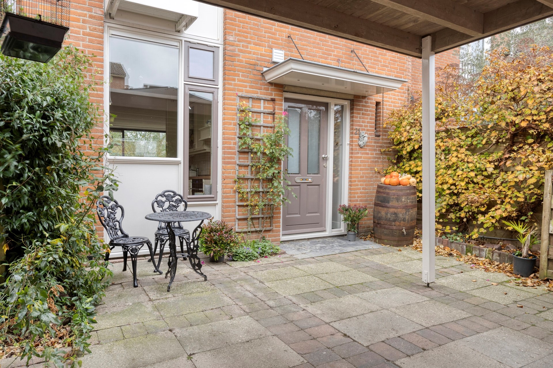 Ook aan de voorzijde is het heerlijk vertoeven: bij de carport is een zithoekje gecreëerd en zit je lekker beschut. De perfecte plek om even buiten te zitten om met een kop koffie je dag te starten of te eindigen.