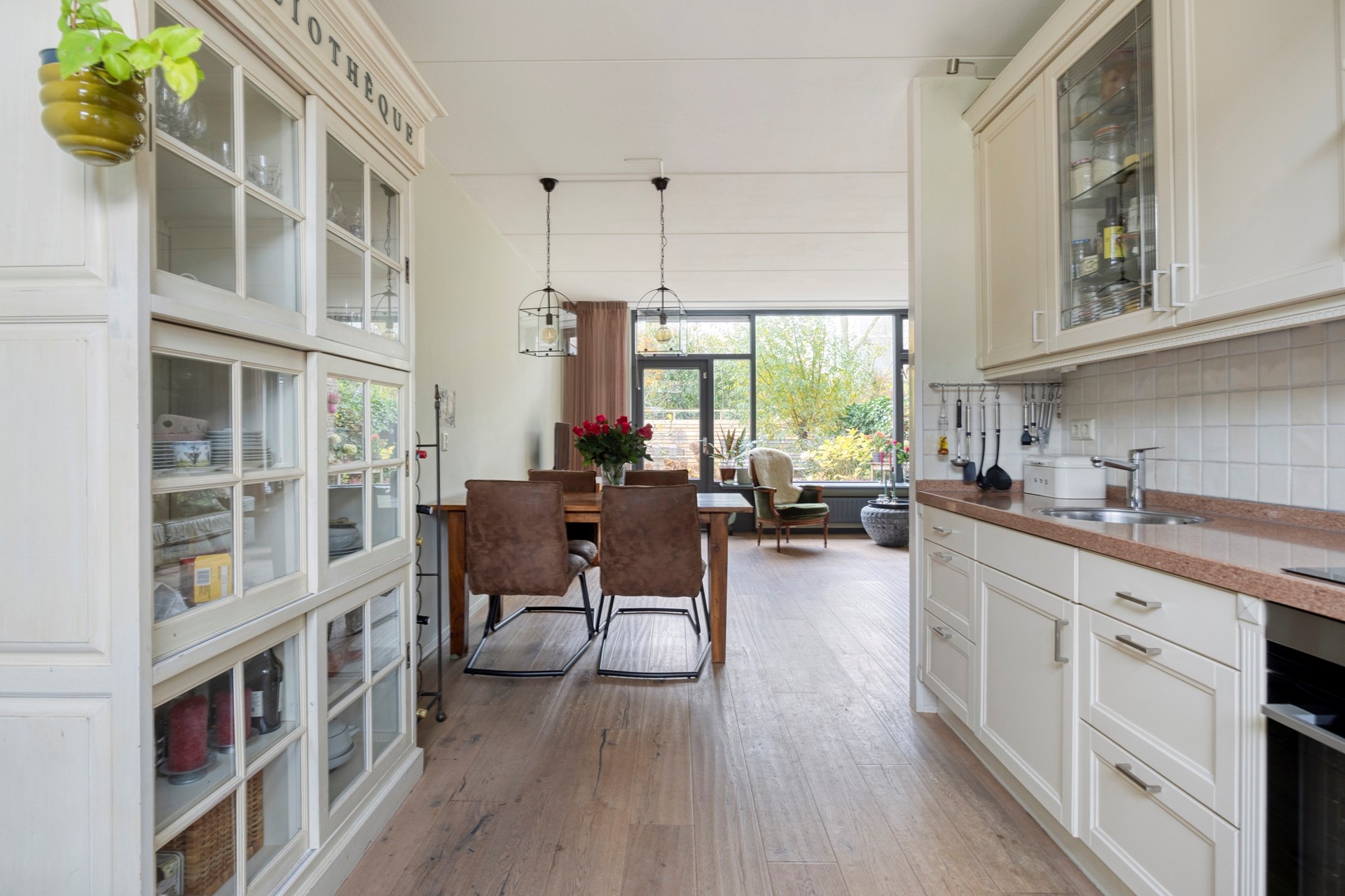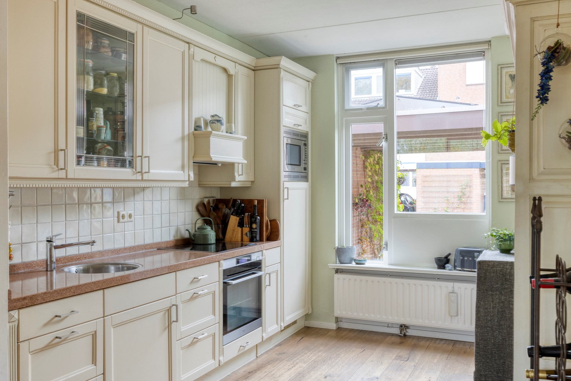 Via de hal stap je de woonkamer binnen; een heerlijke, lichte leefruimte met vrij uitzicht op de achtertuin. De strak gestuukte wanden, frisse kleuren en lichte eiken parketvloer zorgen samen voor een sfeervol geheel. Een plek waar je je direct thuis voelt. De open keuken aan de voorzijde is uitgevoerd in een lichte kleurstelling en voorzien van diverse inbouwapparatuur, zoals een hetelucht-/stoomoven, koelkast, magnetron en inductiekookplaat. De losse vaatwasser blijft achter.