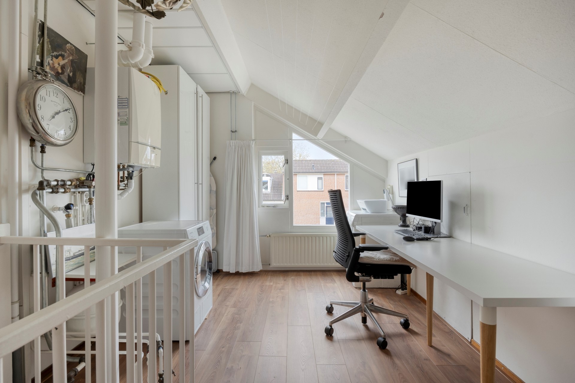 De tweede verdieping verrast met een grote vierde slaapkamer, volop licht en bergruimte. Op de overloop is plaats voor de wasmachine, cv-installatie én een werkplek; ideaal voor thuiswerken of studeren.