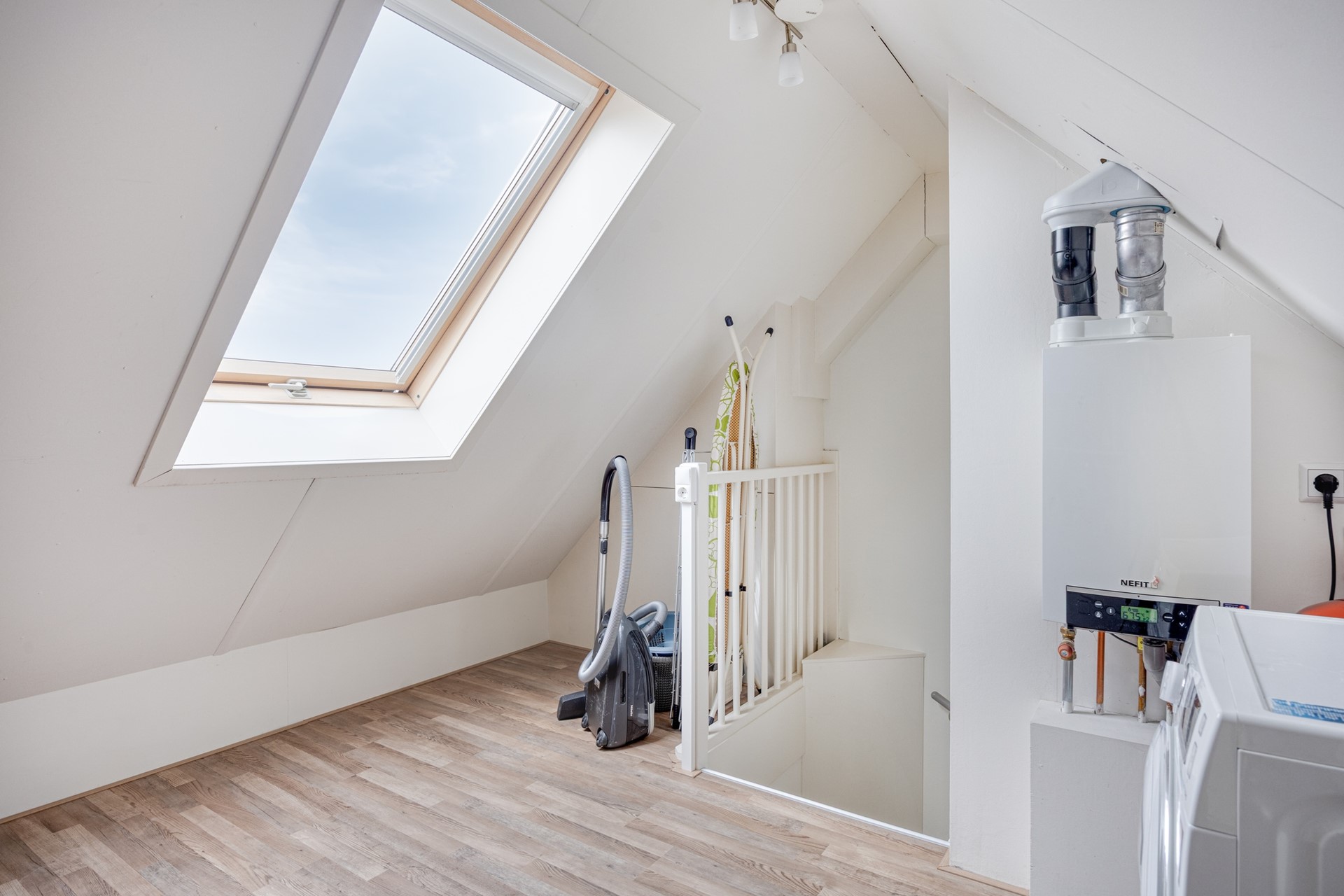 De tweede verdieping is via een vaste trap bereikbaar en is momenteel een open ruimte. Een fijne ruimte voor een werkplek, hobby of een extra slaapkamer. De wasmachine-aansluiting en ook de c.v. installatie zijn in deze ruimte aanwezig.