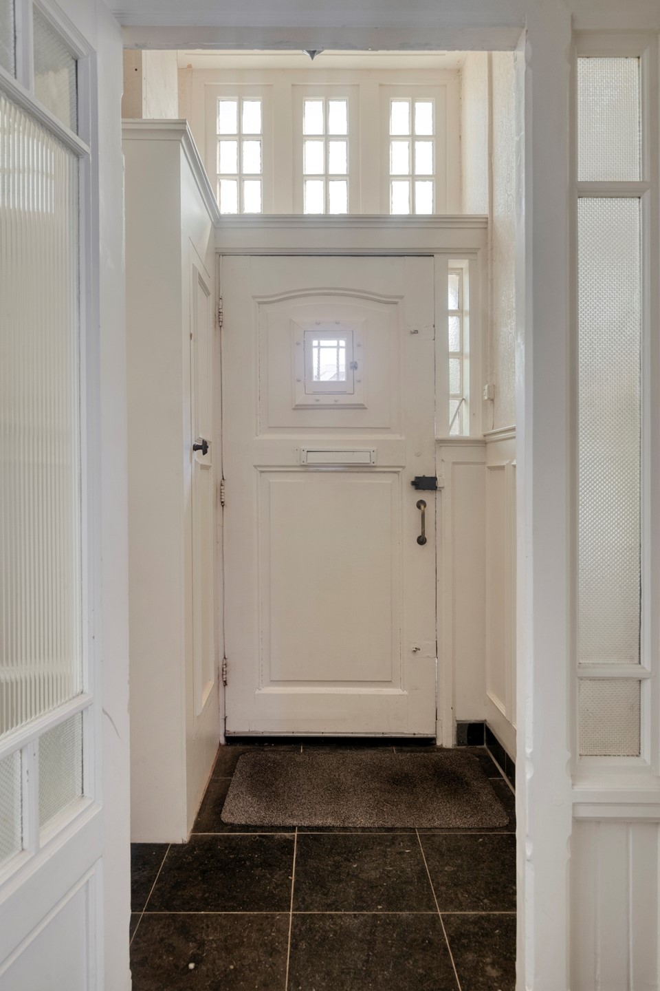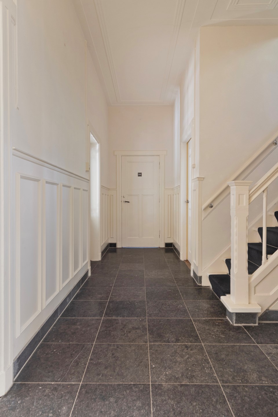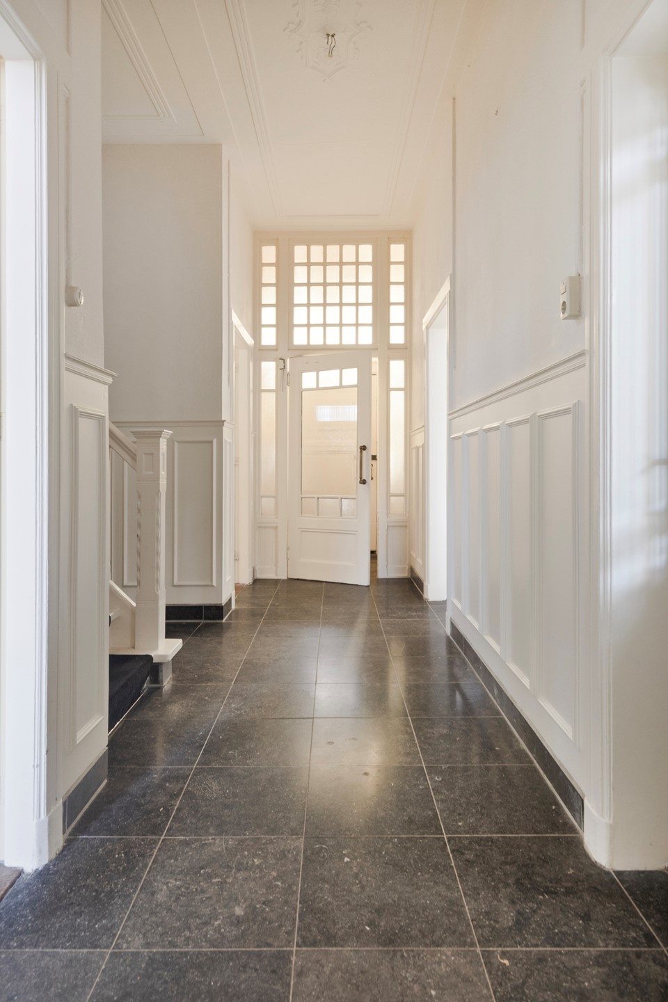 Als u binnenkomst door de statige voordeur, langs de chique vestibule met authentieke klapdeur en de hal betreedt met zijn hoge plafonds, fraaie deuren, lambrisering en trappartij met bordes, zult u ongetwijfeld onder de indruk zijn en wederom bevestigd worden; hier woon je op stand. Deze imposante hal is de centrale ruimte van het huis en biedt toegang naar alle vertrekken.