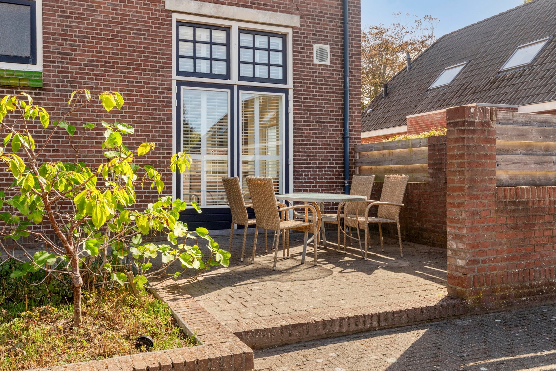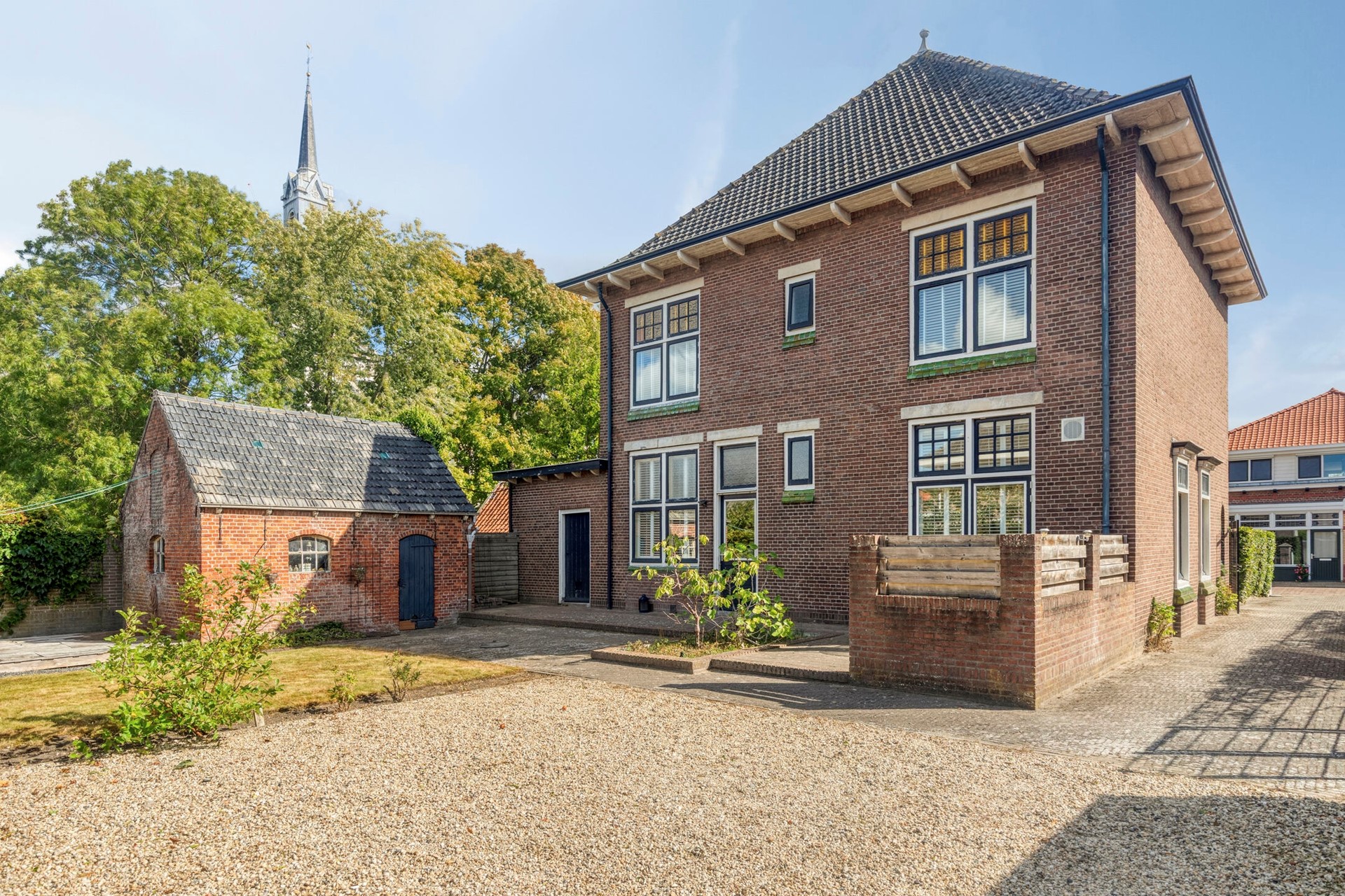 De tuin ligt lekker op de zon, op het westen, en heeft een grote losstaande schuur aan de rand van de tuin. Aan de zijkant ligt een brede lange oprit. Deze heeft ter hoogte van de voorgevel een afsluitbaar hek. Uw gasten en/of gezinsleden kunnen doorrijden naar achter, waar plaats is voor een paar auto’s.