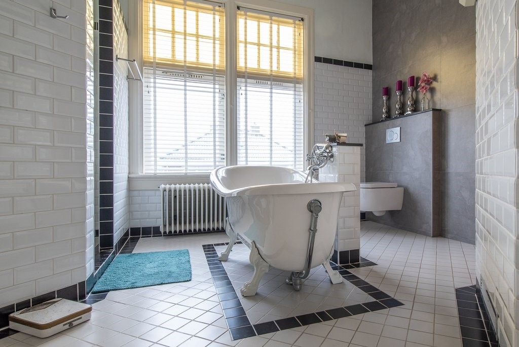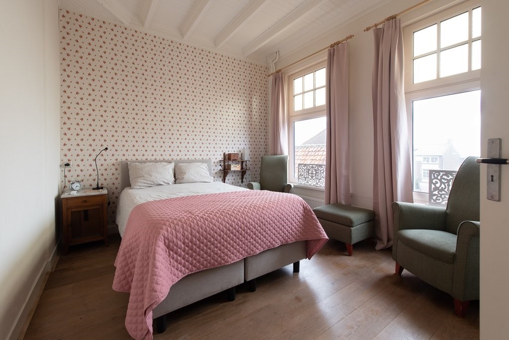 Slaapkamer 3: Via een portaaltje betreedt u de slaapkamer van 16 m². Deze kamer ligt aan de achterzijde en heeft een deur naar het platte dak en het raam dat uitziet op de achtertuin. Ook hier weer sfeer door de hoge plafonds (ook een balkenplafond) en hoge ramen. De badkamer is bereikbaar via het portaaltje en een heeft een douche, een wastafelmeubel en een toilet.