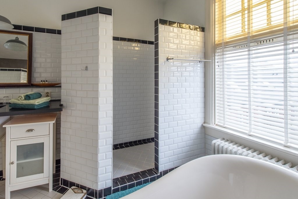 Slaapkamer 2: Deze kamer ligt eveneens aan de voorzijde en meet 4 x 3,5 m. Ook deze kamer heeft die hoge ramen, het balkenplafond geeft nog wat extra sfeer. De badkamer is en suite en voorziet in een wastafelmeubel, een toilet en een douche.