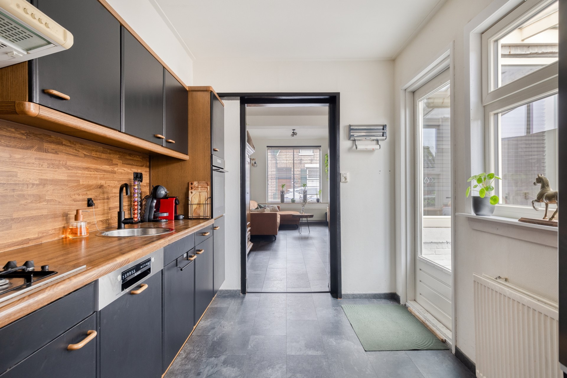 Via de hal kom je in de L- vormige woonkamer. Deze is lekker ruim en licht en heeft aansluitend de keuken. Deze was al aanwezig toen de huidige eigenaar de woning kocht. Apparatuur als vaatwasser, oven en kraan zijn in 2025 vernieuwd. Achter de keuken is een portaal - waar de wasmachine zijn plaats heeft - met toegang tot het toilet en de badkamer. Hier zijn in 2024 de wanden geïsoleerd, opnieuw betegeld, voorzien van nieuwe douchecabine, kranen en wastafelmeubel. Het bad is teruggeplaatst. De woning heeft aan de achterzijde een aanbouw/serre, waarlangs je naar buiten loopt.